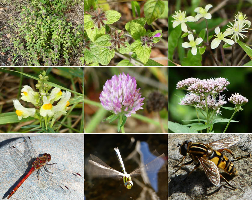 Wirbeldost, Waldrebe - Frauenflachs. Rotklee, Wasserdost - Große Heidelibelle, Blaugrüne Mosaikjungfer, Sumpf-Schwebfliege. Fotos AGON/Ackermann, 10.09.2025 |