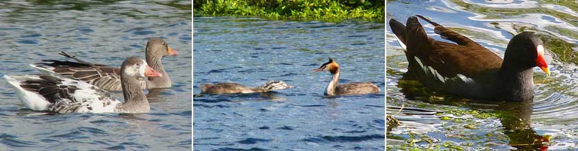 ca.330 Graugänse, ca. 65 Kanadagänse, ca. 100 Nilgänse, 7 Rostgänse, 27 Stockenten, 1 Schnatterente, 23 Reiherenten, 4 Haubentaucher, 3 Zwergtaucher, 18 Graureiher, 2 Silberreiher, 4 Kormorane, 2 Höckerschwäne, 30 Blässrallen, 1 Teichralle, 3 Eisvögel;