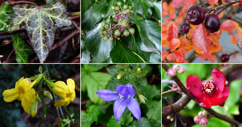Von D. Ackermann. Ist Ihnen auch schon aufgefallen, dass der Efeu zwei verschiedene Blätter hervorbringt? Die jungen Blätter sind schön gezeichnet und geformt, die älteren sind Einfachere im Bereich der Früchte, (die übrigens gern von Mönchsgrasmücken gefressen werden). Der Cottoneaster hat im Gegensatz dazu schönes gelb-rotes Herbstlaub und tiefdunkelrote Beeren. Dass der Winterjasmin schon blüht und einzelne Glockenblumen noch Blüten haben, daran haben wir uns gewöhnt. Aber nun öffnen sich bereits einzene Blüten der Zierquitten.