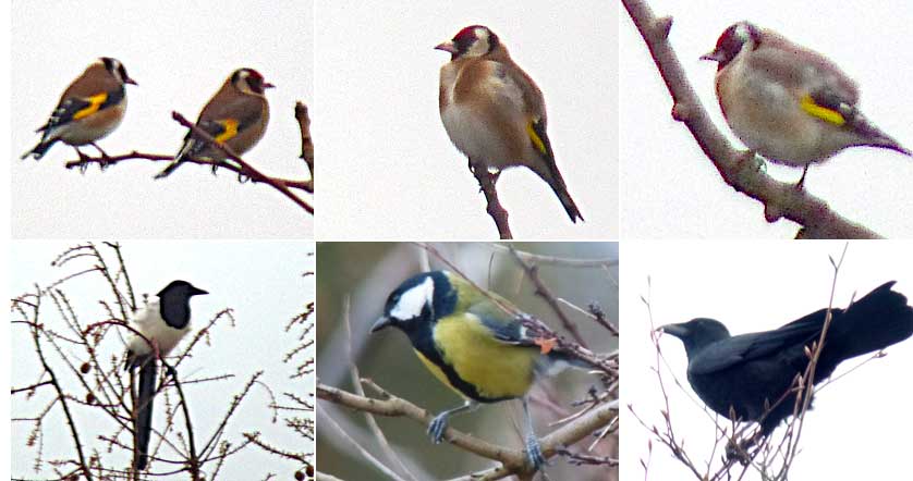 oben: Stieglitze inm Ginkgo-Baum - unten: Elster, Kohlmeise, Rabenkrähe. Fotos AGON/Ackermann, 14.12.2025 |