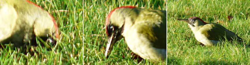 Von U.&D.Ackermann. Heute kam mal wieder ein Grünspecht vorbei. Aber anstatt sich den hinteren Rasen zum Vertikutieren vorzunehmen, landete er im Rasen des Vorgartens auf der Suche nach Ameisennestern. Aber natürlich musste er dort mit allerlei Störungen rechnen - und so kam es, dass er sehr bald wieder abflog.