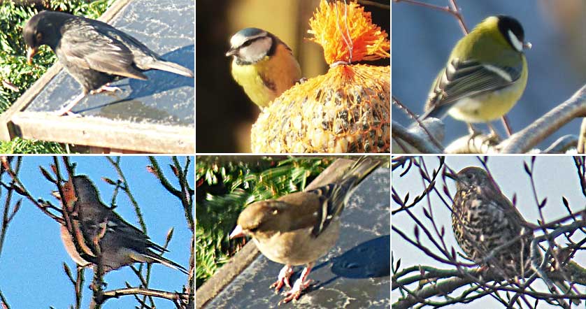 | Rotkehlchen, Kohlmeise, Blaumeise - Ringeltaube, Buntspecht. Fotos AGON/Ackermann, 23.12.2025 |