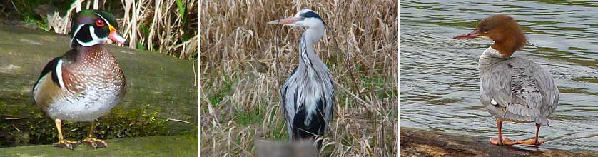 1Kormoran, 2 Graureiher, 1 Silberreiher, 57 Stockenten, 5 Reiherenten, 6 Blässrallen, 4 Teichrallen, 3 Zwergtaucher;