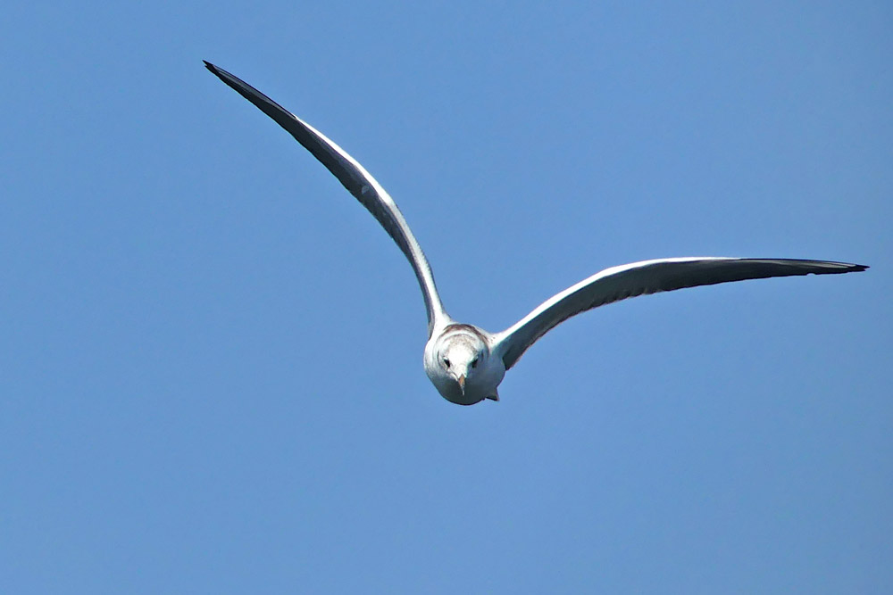 Eine anfliegende, junge Lachmöwe - vom Autofokus perfekt getroffen. Bei den Flugaufnahmen wird aber auch die abnehmende Helligkeit zum Rand, besonders zum linken, deutlich. Ob das auch ohne Konverter so ist, habe ich noch nicht probiert.