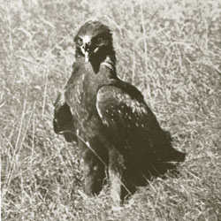 Solch ein Schreiadlerhorst stand immer in einer ganz bestimmten Umgebung. Wer sich darauf verstand, der spürte, wo es ein Schreiadlerpaar geben mußte. Der Boden war etwas bruchig, oft war ein kleiner Wassergraben durchgezogen. Es standen Fichten, Birken, Kiefern und Eichen durcheinander. Unten wuchsen Himbeeren und Farne oder auch Brennesseln. Oft war der niedrige Horst schon weithin zu sehen. Er war dann gleich als ein Schreiadlerhorst zu erkennen. Denn diese Adler tragen oft grüne Zweige zum Horst. Und wenn die Zweige frisch waren, dann war der Horst auch sicher besetzt. Meist blickte auch schon ein Köpfchen mit weißem Flaum über das grüne Gezweig. Oft rief ich den jungen Adler an, ehe ich den Adler sah. Ich tat es mit einem leisen Kjück, zu dem ich die Luft einzog. Dann erhielt ich immer eine Antwort. Diese Adler sind im Horstraum außerordentlich ruffreudig, daher rührt ja auch ihr Name. Dann erhielt ich immer eine Antwort. Und dann kam der Blick in den Horst!