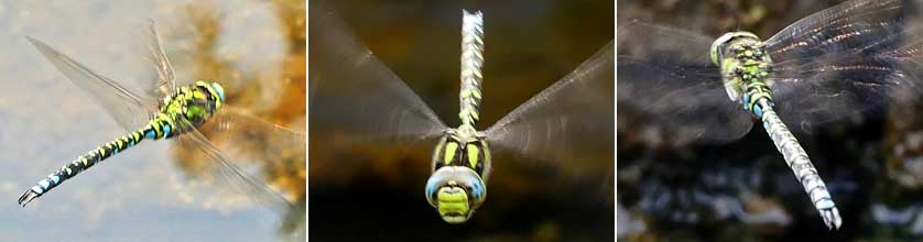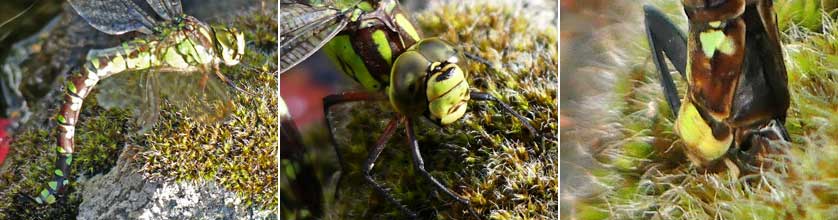 Blaugrüne Mosaikjungfer legt Eier, Porträt und Spitze des Hinterleibs mit Anhängen (links) und Legeröhre (rechts). Fotos AGON/Ackermann, 11.09.2025 |