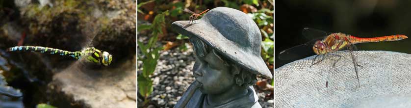Blaugrüne Mosaikjungfer, Gartenfigur mit Hut und Libelle, Große Heidelibelle. Fotos AGON/Ackermann, 01.09.2025 |