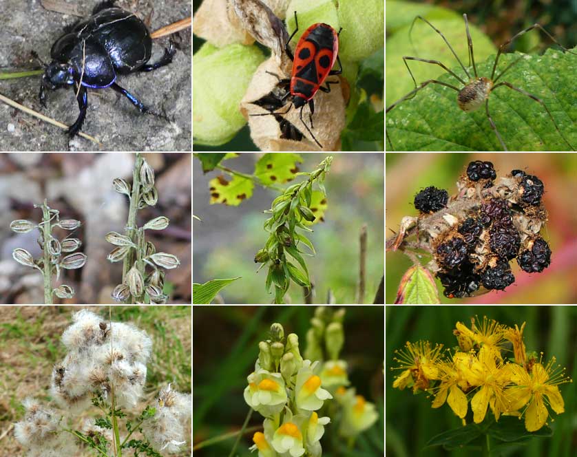Frühlingsmistkäfer, Feuerwanze und Weberknecht (Rilaena triangularis) - Vogelnestwurz, Breitblättrige Sumpfwurz, Brombeeren - Acker-Kratzdistel, Frauenflachs, Johanniskraut. Fotos AGON/Ackermann, 31.08.2025 |