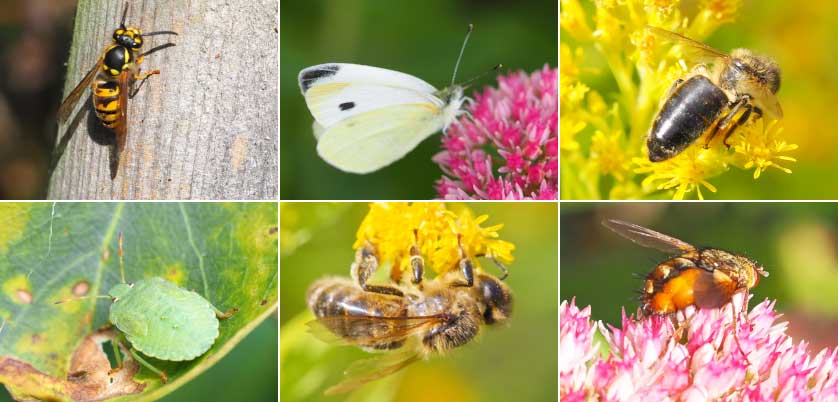 Wespe raspelt morsches Holz für den Nestbau, Kohlweißling, Wildbiene - Grüne Wanze, Wildbiene, Raupenfliege. Fotos AGON/Habedank, im September 2025 |