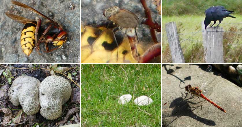 Tote Hornisse und mit Verwerter, Rabenkrähe - Kartoffelbovist, Wiesenchampignons, Große Heidelibelle. Fotos AGON/Ackermann, 18.09.2025 |