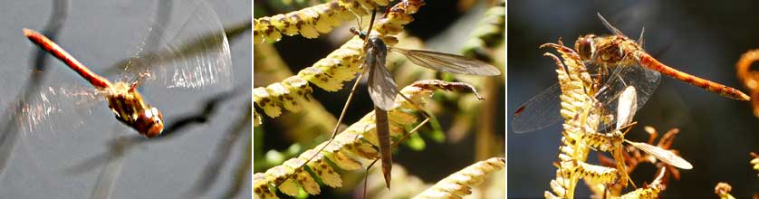 Von U.&D.Ackermann. Zwar bin ich heute Vormittag durch den Sembergwald gegangen, habe aber nichts Berichtenswertes gefunden. Erst zu Hause begrüßten wir die Heidelibelle. Was wir aber dann sahen, erstaunte uns. Schon vorher hatten wir die Wiesenschnake in den schon vergilbenden Wedeln der Wurmfarnpflanze am Teichrand gesehen. Sie saß ein gutes Stück tiefer als auf dem Foto. Plötzlich setzte sich die Heidelibelle auf den gleichen abgebrochenen Wedel. Dann flog sie einige Runden, kam dann aber zurück. Die Schnake war in der Zwischenzeit ein Stück höher geklettert. Nun saß sie unmittelbar unter der Libelle. Wiesenschnaken passen eigentlich gut ins Beuteschema der Heidelibellen. Wir waren schon sehr gespannt, was nun passieren würde. Beide Tiere rührten sich aber nicht. Deshalb konnte die Heidelibelle die unter ihr sitzende Beute offenbar auch nicht sehen mit ihren Komplexaugen. Die Beute müsste sich also bewegen - das tat sie aber nicht. - Nach der Heidelibelle kam auch noch ein Paarungstandem der gleichen Art und eine Blaugrüne Mosaikjungfer. Alle drei verschwanden aber wieder sehr schnell.