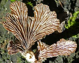 Bei der Kontrolle liegenden Totholzes fielen mir durch Umwenden einige Spaltblättlinge auf, die ich durch Betrachten der Pilzoberfläche nicht erkannt hätte.