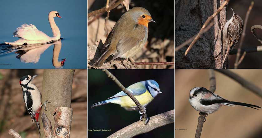 von oben links: Höckerschwan, Rotkehlchen, Gartenbaumläufer - Buntspecht, Blaumeise, Schwanzmeise. Fotos G.Reinartz, 14.01.2018 |