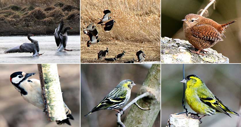 Von oben links: Pfeifente, Spießente, Buntspecht - Heckenbraunelle, Buchfink Männchen und Weibchen - Zaunkönig, Kohlmeise und Schwanzmeise. Fotos AGON/Ackermann, 14.01.2018 |