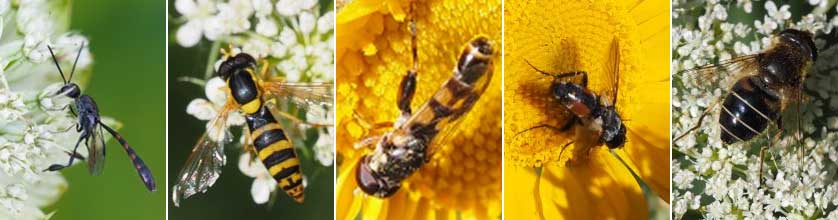 | von links: Schlupfwespe, Große Waldschwebfliege,Gemeine Langbauchschwebfliege . Fotos u. Bestimmung AGON/Habedank, 04.07.2018 |