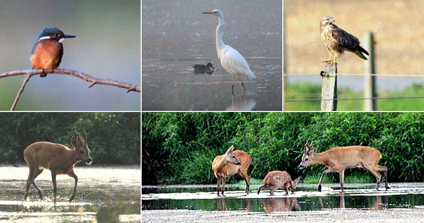 v.o.l. Eisvogel, junges Teichhuhn, Reh - Gebänderte Prachtlibelle, Silberreiher und Nilgansfamilie. Fotos P.Krüger, 19.07.2018 |