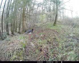 Von O.Herrmann. Der Schwarzstorch ist wieder da und zur Nahrungssuche unterwegs. Die Aufnahme der Wildkamera links oben entstand in der Umgebung von Grürmannsheide.